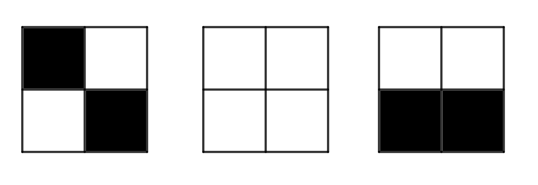 En un tauler $2\times 2$, volem acolorir cada quadrat de color blanc o negre. Direm que una coloració és «egarenca» si el nombre de quadrats negres és parell.
