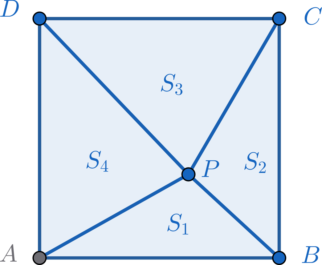 Dintre d’un quadrat $ABCD$, triem un punt $P$, i denotem les àrees dels triangles que es formen $[APB] = S_1$, $[BPC] = S_2$, $[CPD] = S_3$, $[DPA] = S_4$, tal com es veu al dibuix.