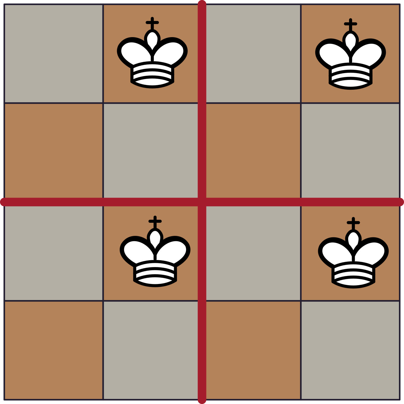 Encara més, suposem que poguéssim posar $5$ reis. Pel principi del colomar, veiem que hi haurà un d’aquests blocs $2\times2$ amb dos reis. Però això és impossible, ja que aleshores aquests dos s’estarien atacant entre ells.