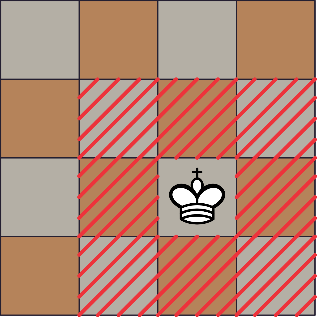 Per exemple, si col·loquem un rei com a la següent figura, no en podem col·locar cap altre a les caselles ratllades en vermell: