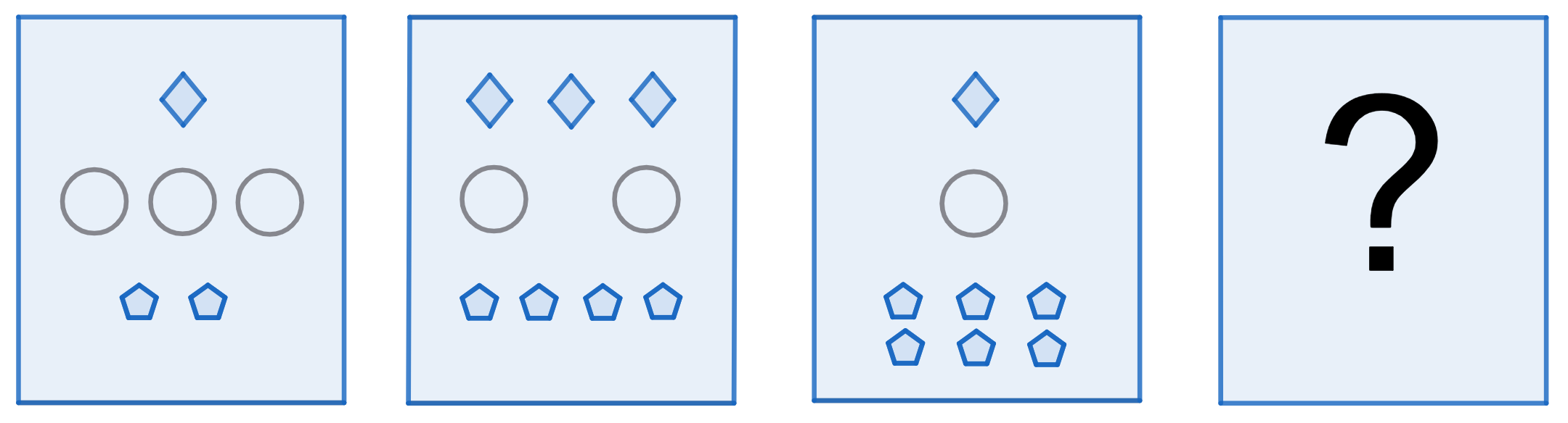 - Els rombes de dalt alternen $1$ rombe, $3$ rombes, $1$ rombe. Ens fa pensar que la pròxima carta hauria de tenir $3$ rombes.