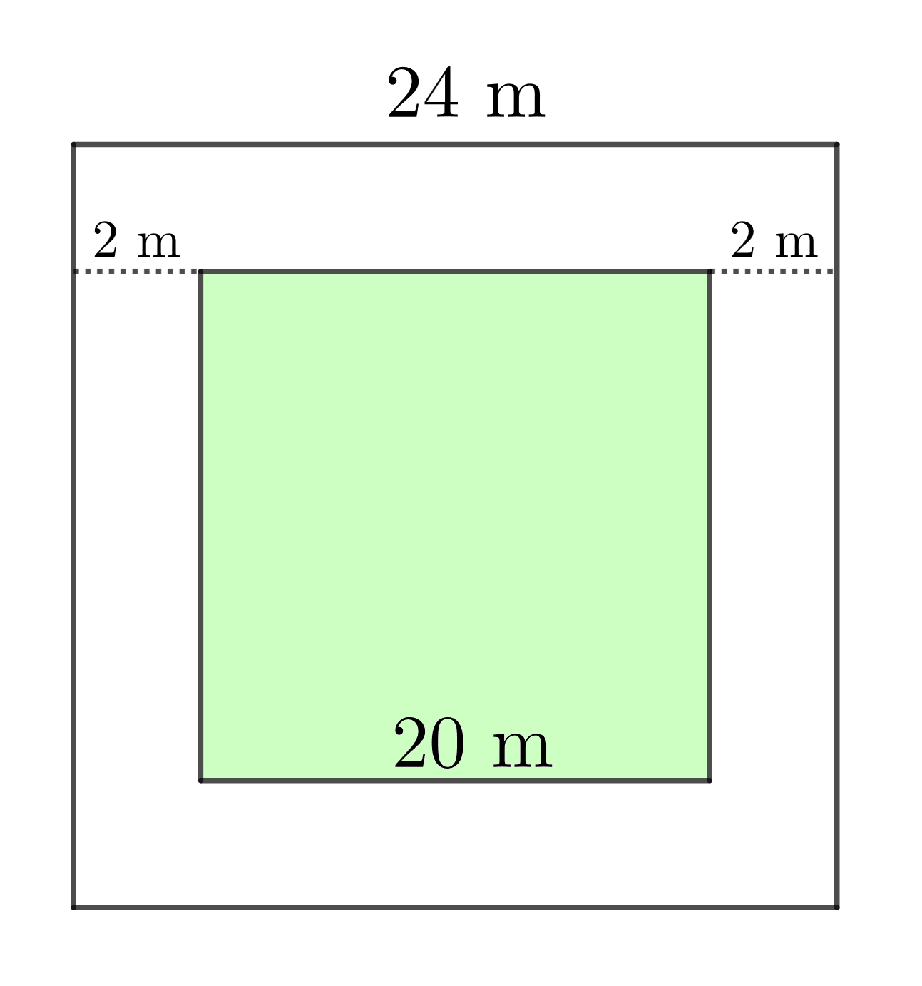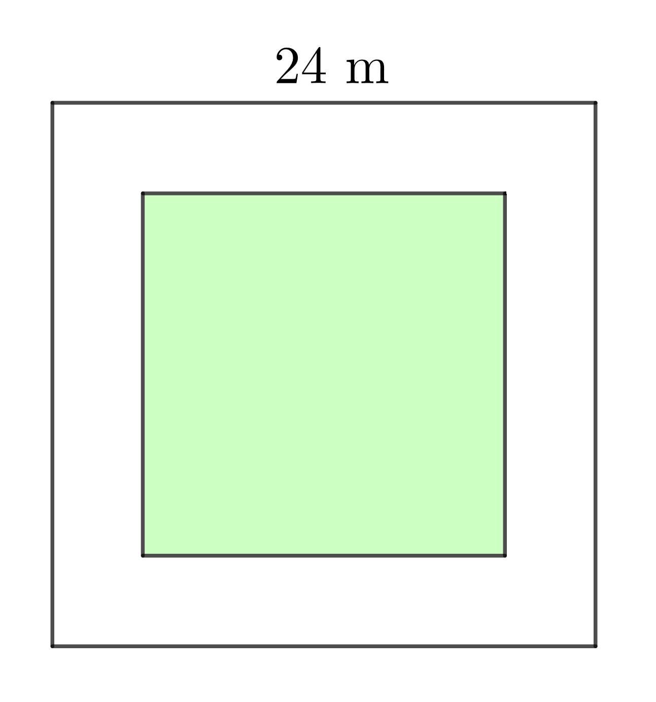 D’acord amb l’enunciat, el costat inicial del jardí és de $24\text{ m}$, però aleshores destinem $2\text{ m}$ a cada costat per al camí.