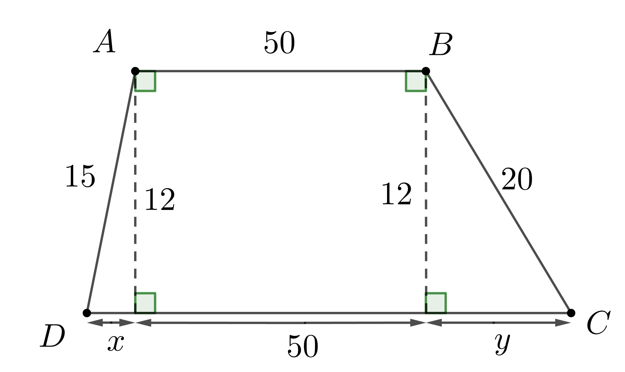Només ens falta trobar $x$ i $y$ pel Teorema de Pitàgores. Recorda que és: $$x^2+12^2=15^2$$ $$y^2+12^2=20^2$$